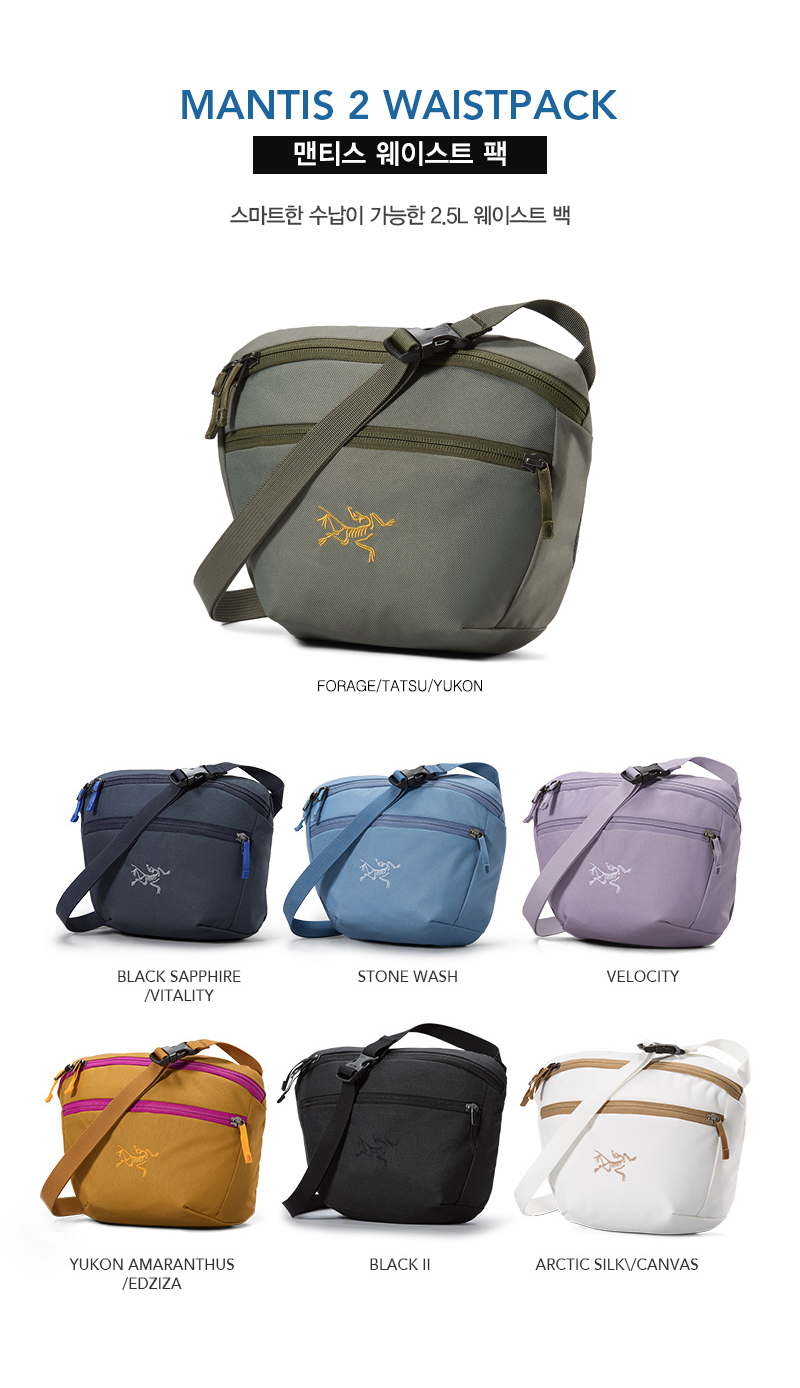 맨티스 1 웨이스트팩보다 넉넉한 사이즈이며, 짧은 산행이나 장거리 여행시 보조가방으로 사용하기 좋습니다.