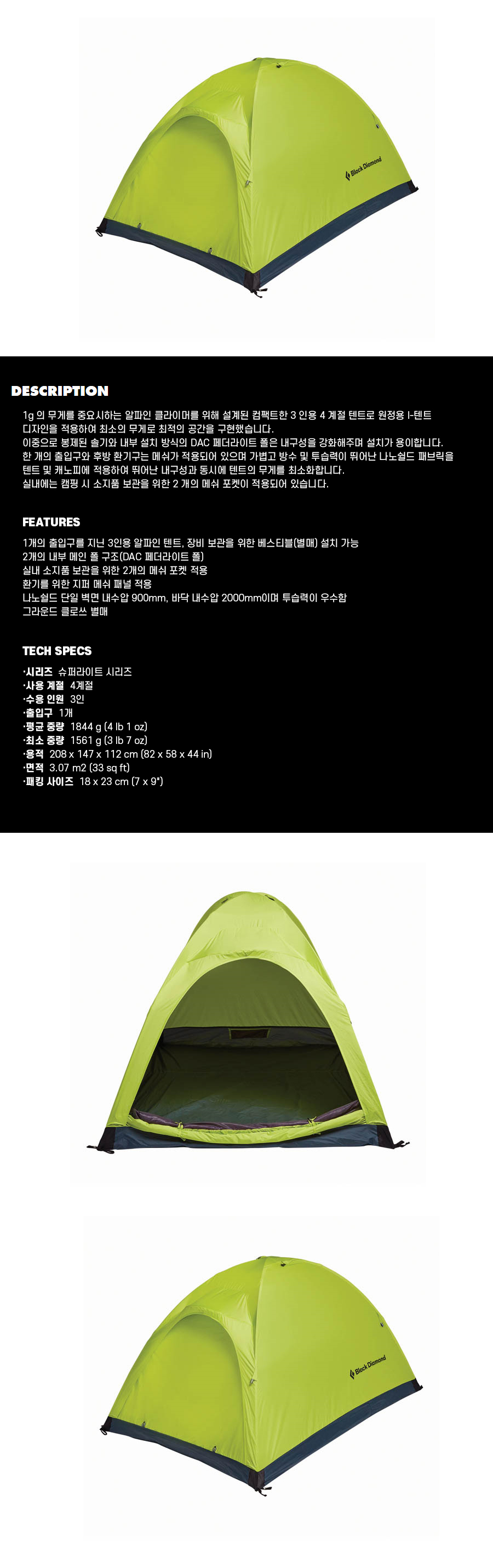 상품별 세부 사양 : 사용 계절 : 4계절 / 수용 인원 : 3인용 / 출입구 : 1개