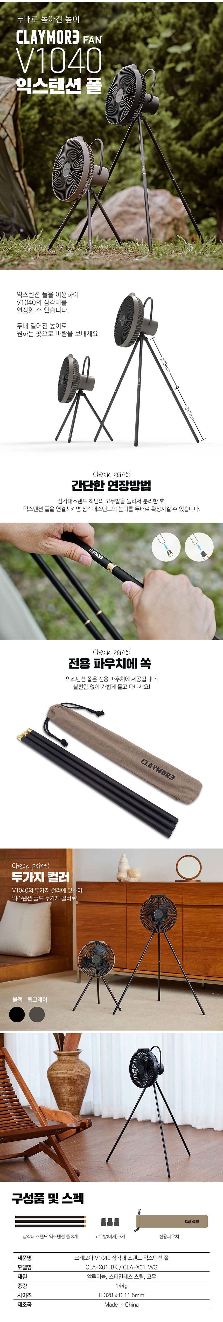 | 제품구성 | 삼각대 스탠드 익스텐션 폴 3개, 고무발(마개) 3개, 전용파우치 |
