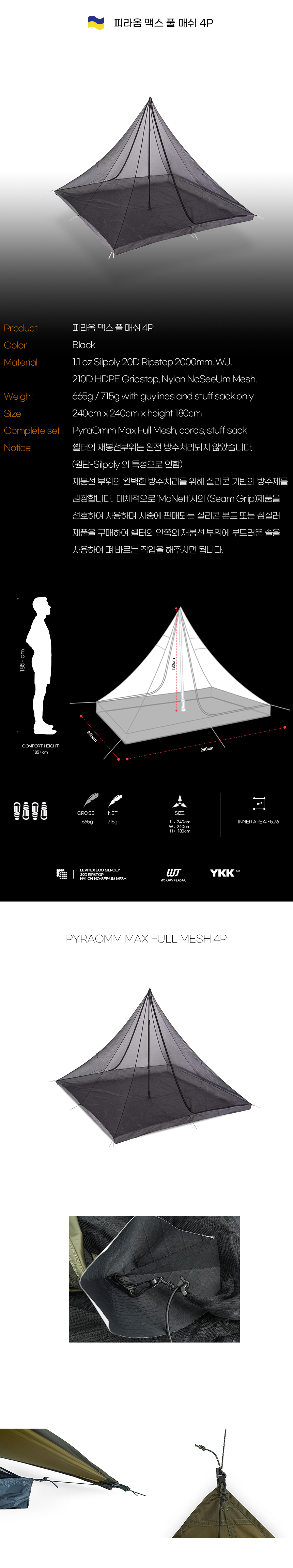 | 크기, 중량 | 사이즈 : 240 x 240 x 180(H)cm / 무게 : 665g (715g with gutlines and stuff sack only) |