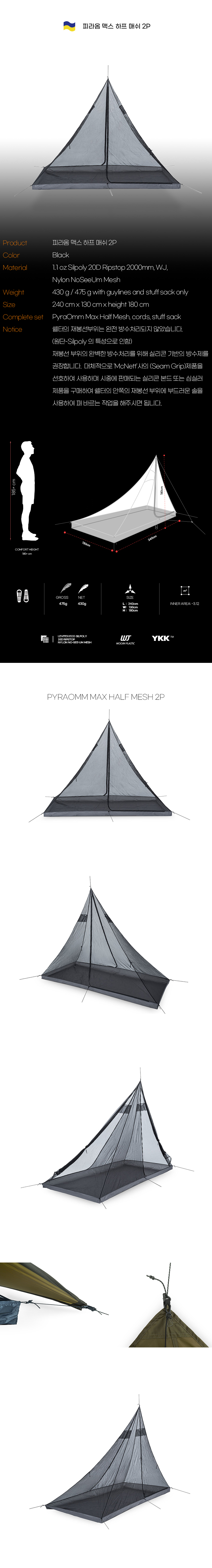 | 크기, 중량 | 사이즈 : 240 x 130 x 180(H)cm / 무게 : 430g (475g with gutlines and stuff sack only) |