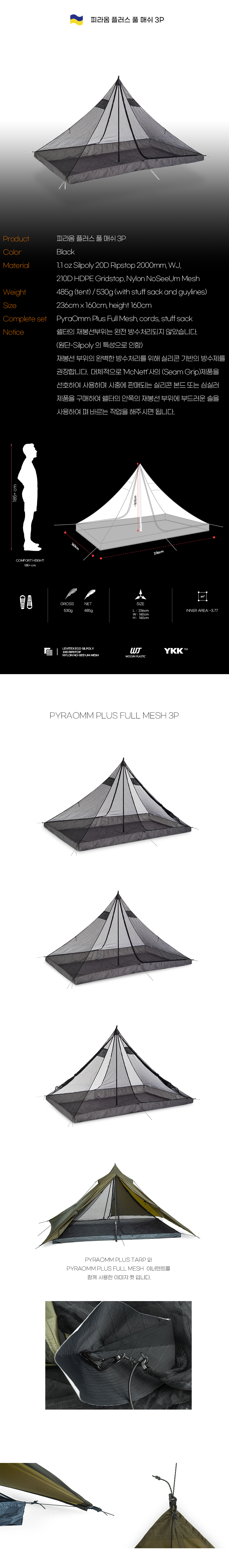 | 크기, 중량 | 사이즈 : 236 x 160 x 160(H)cm / 무게 : 485g (530g with gutlines and stuff sack only) |