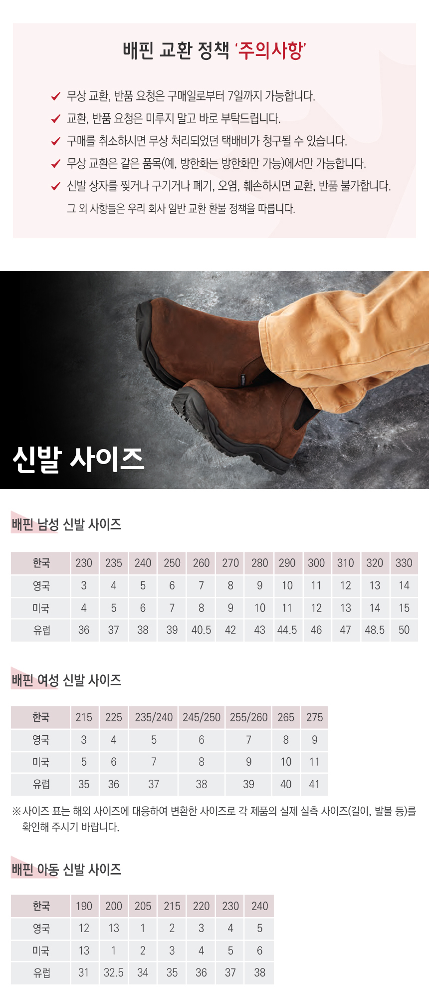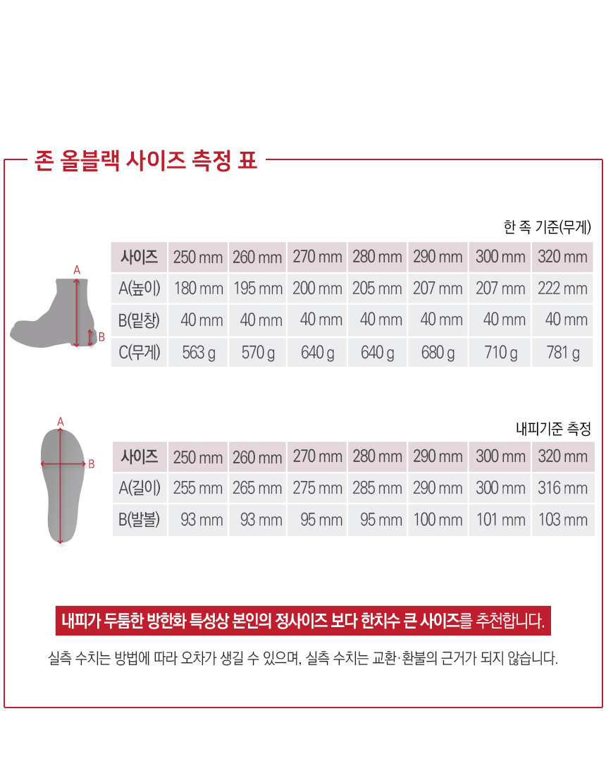 | 크기, 중량 | 발사이즈 : 250, 260, 270, 280, 290, 300, 320mm |