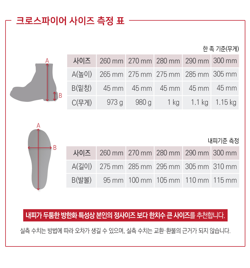 | 크기, 중량 | 발사이즈 : 260, 270, 280, 290, 300mm |